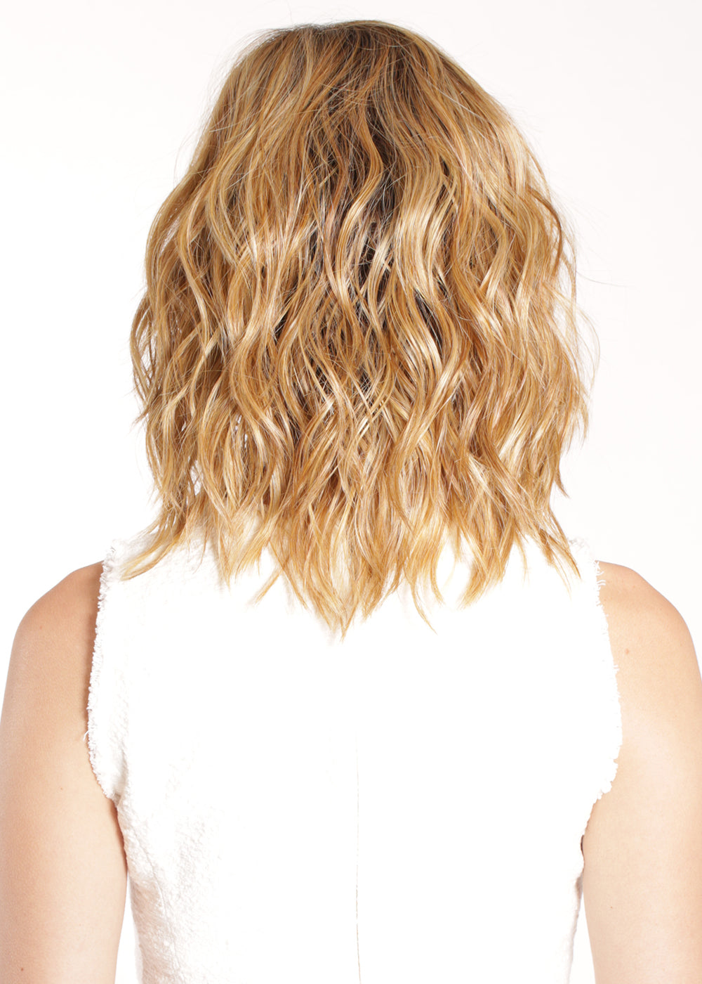 Columbia is an elegant, wavy, shoulder-skimming hairstyle that can take you from day to night effortlessly. Beachy waves fall gently around the shoulder and give movement to this bombshell look.