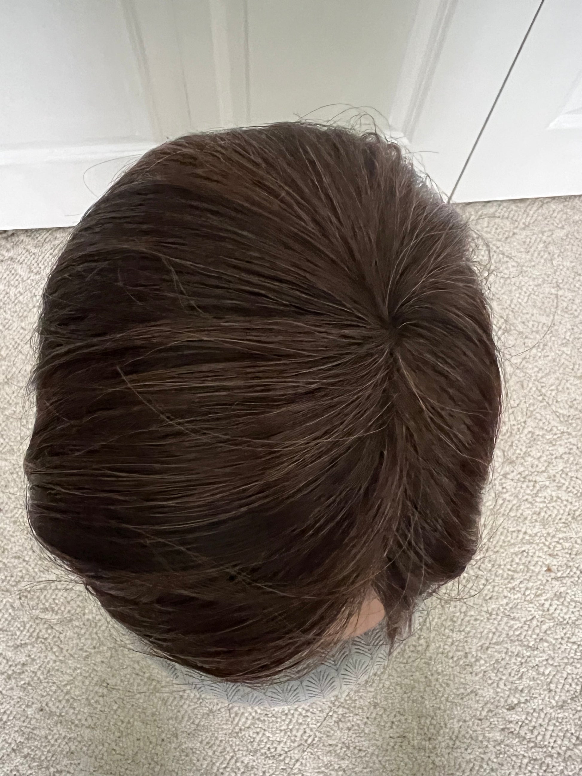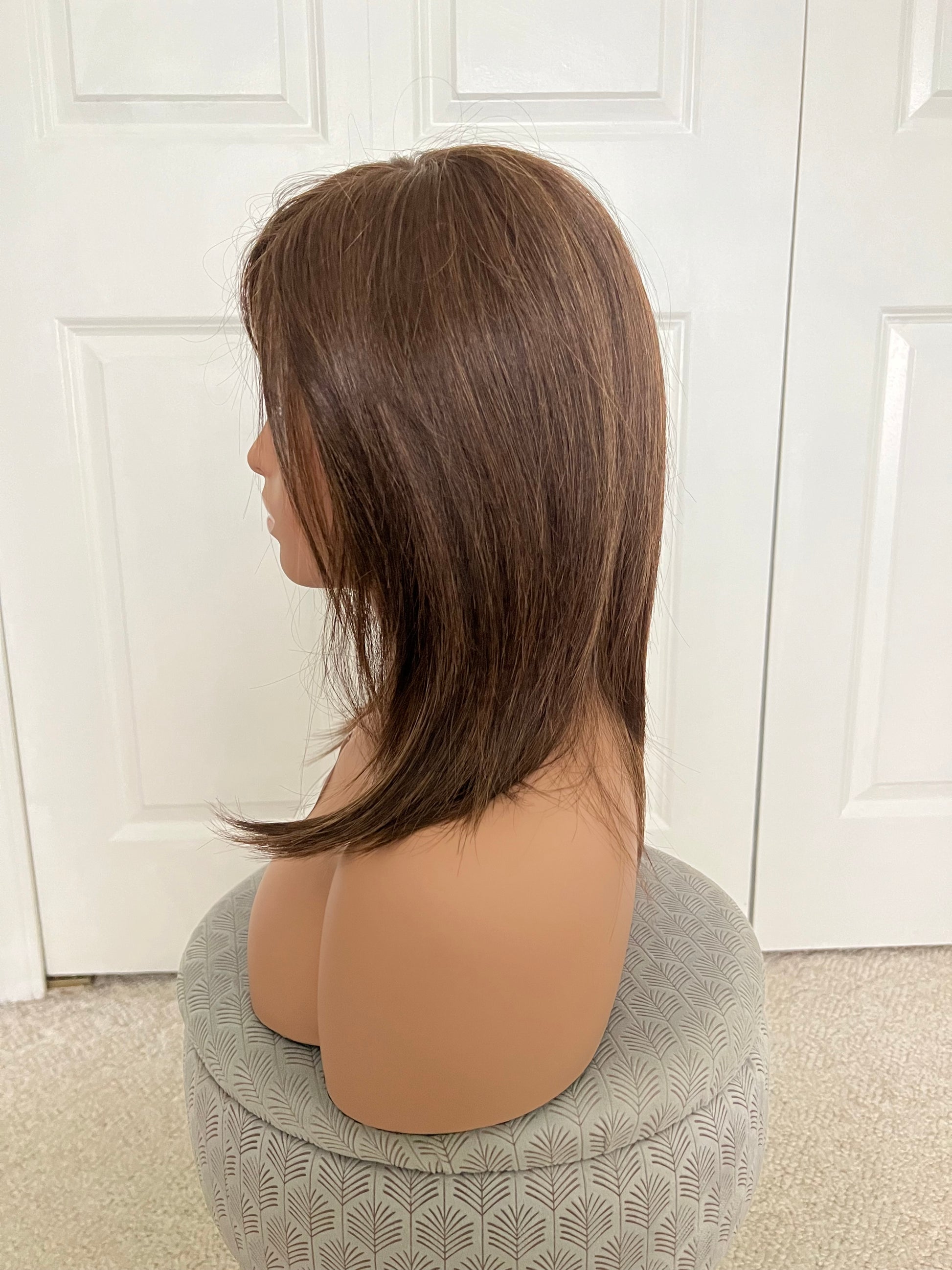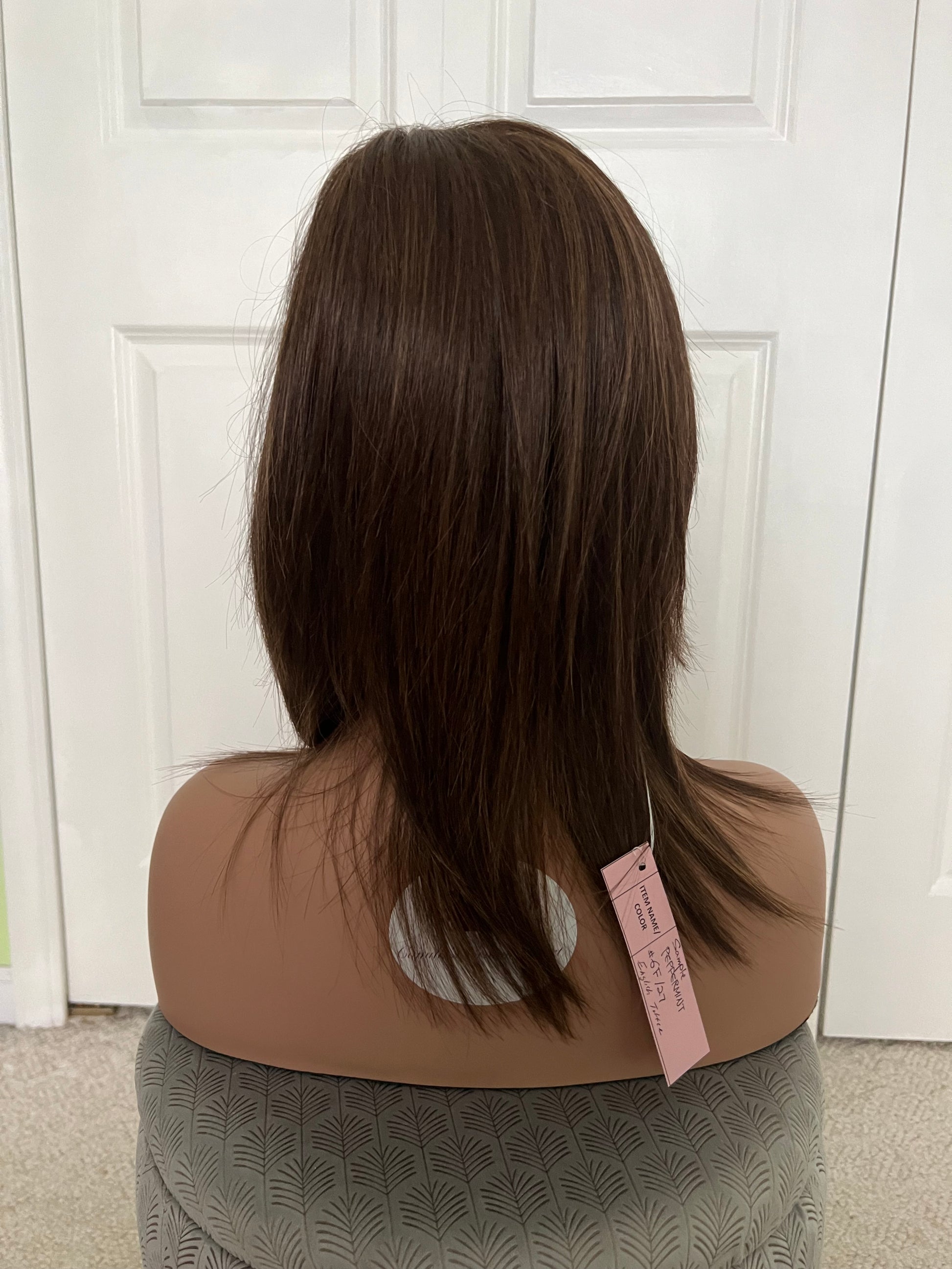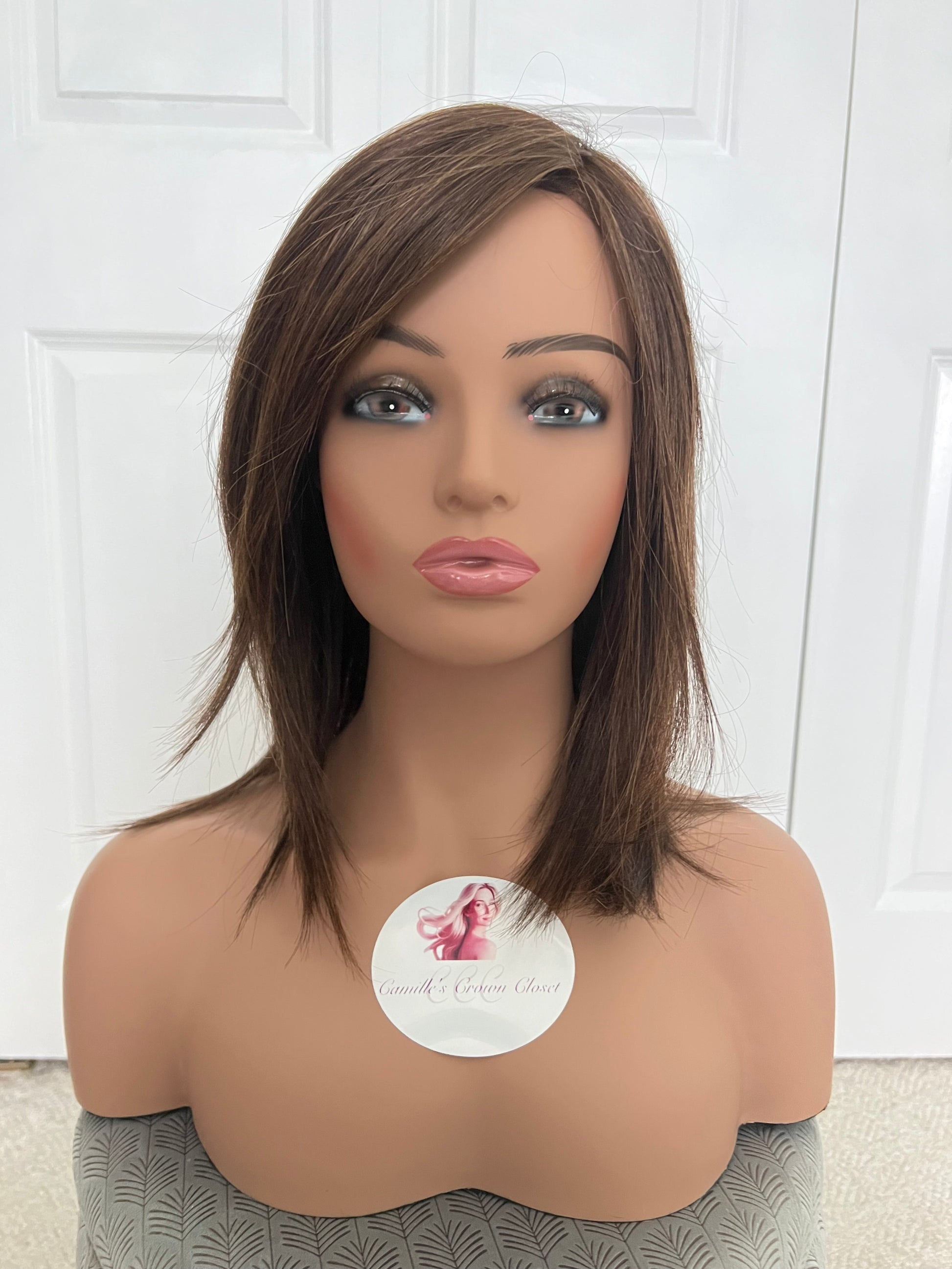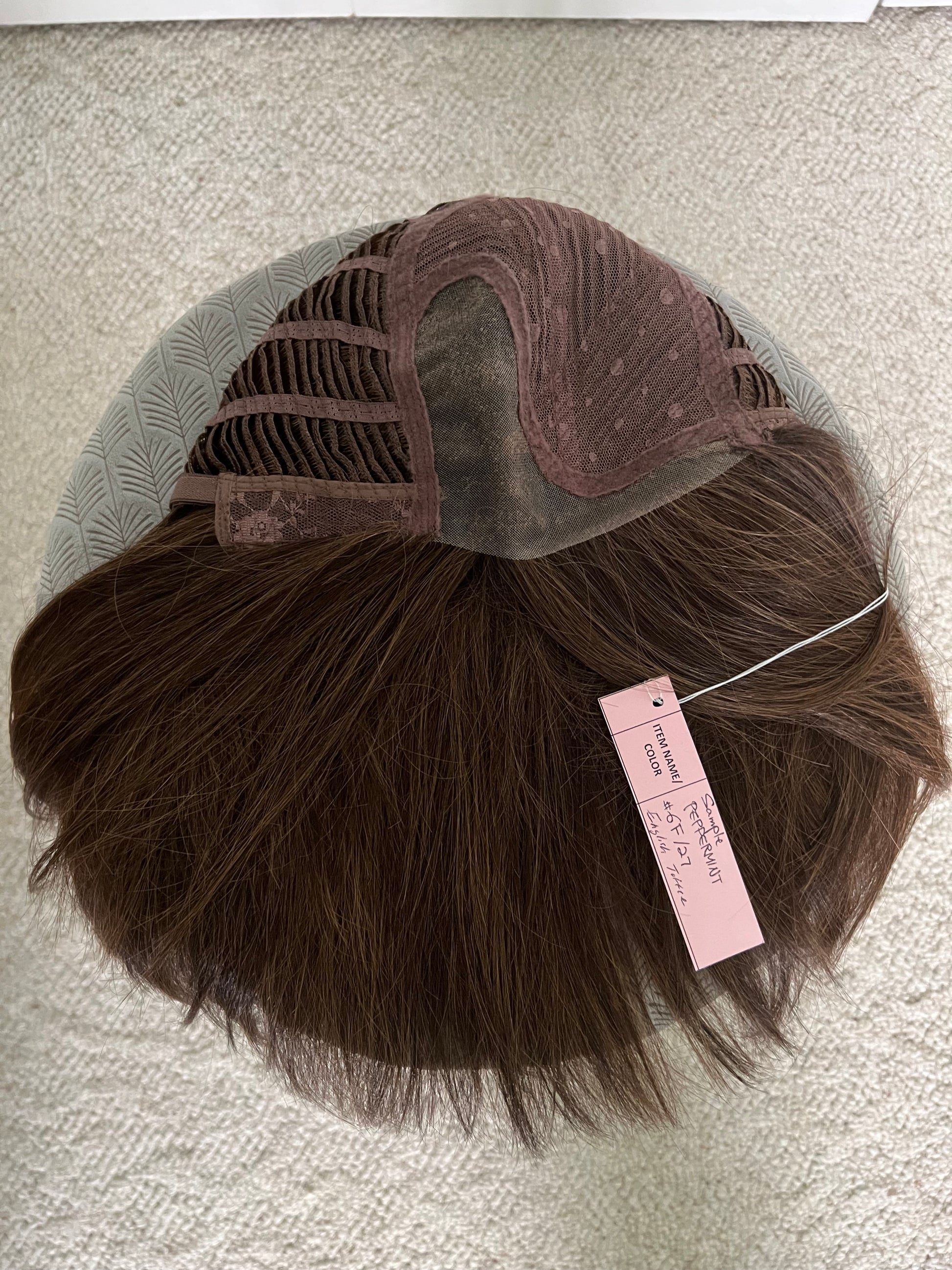 Belle Tress factory sample Peppermint in English Toffee. This is a factory sample, no retail tag, no box. Left mono part, lace front, lace covered ear tabs, bra strap adjusters.