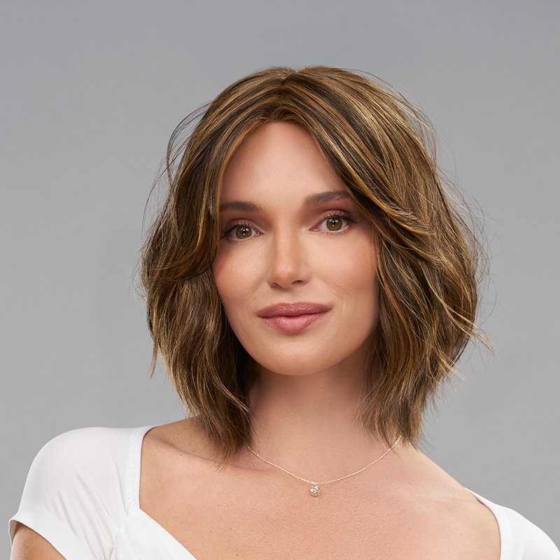Hollie Petite brings casual sophistication to smaller head sizes with her shoulder-length cut and subtle, natural waves. Trending bangs and Heat-Friendly Synthetic fiber allow for versatile styling, while a SmartLace™ front and monofilament top create a seamless, natural appearance. Light density and a hand-tied cap ensure all-day comfort and realistic movement without permatease.
