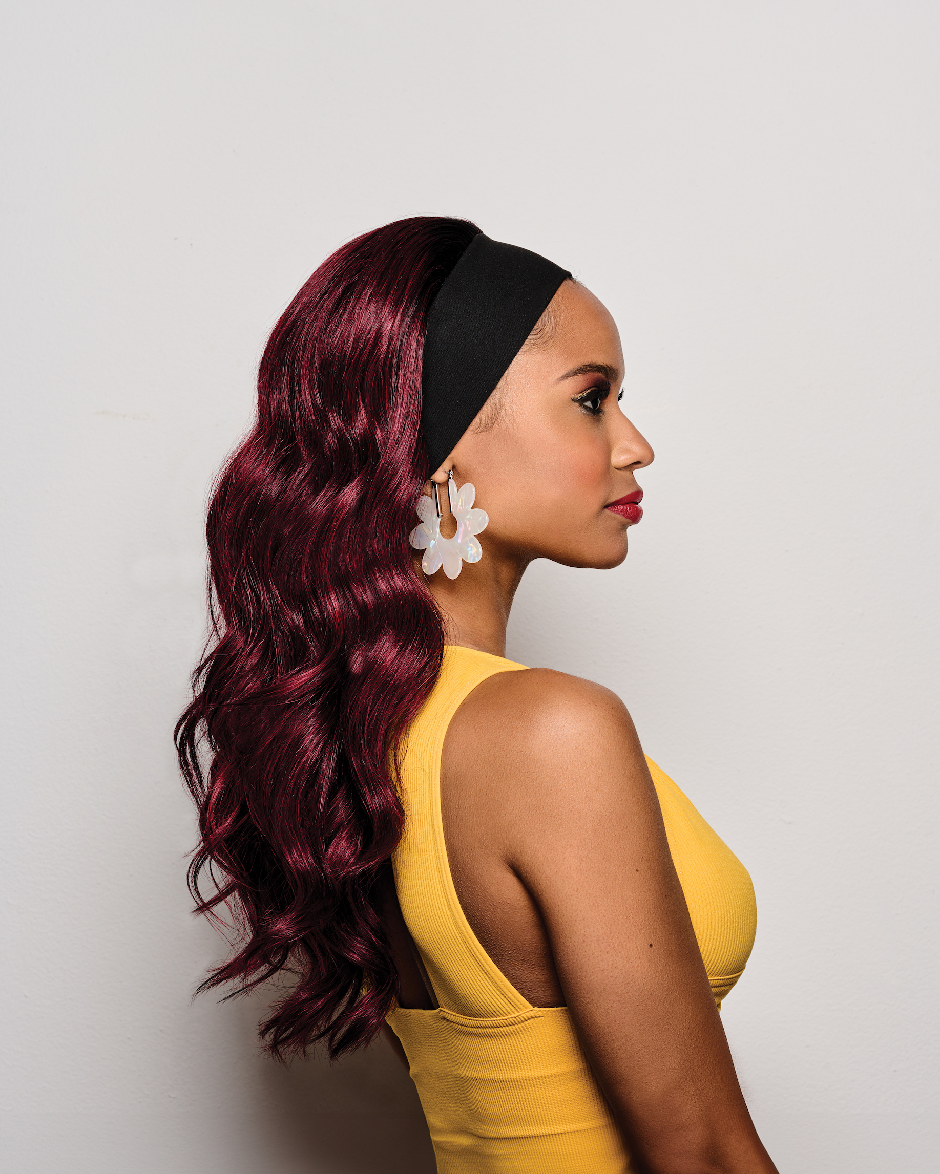 Fashionable, fast and foolproof! A headband wig of long loose waves trimmed in tapered layers to be shorter in the front, longer in the back.