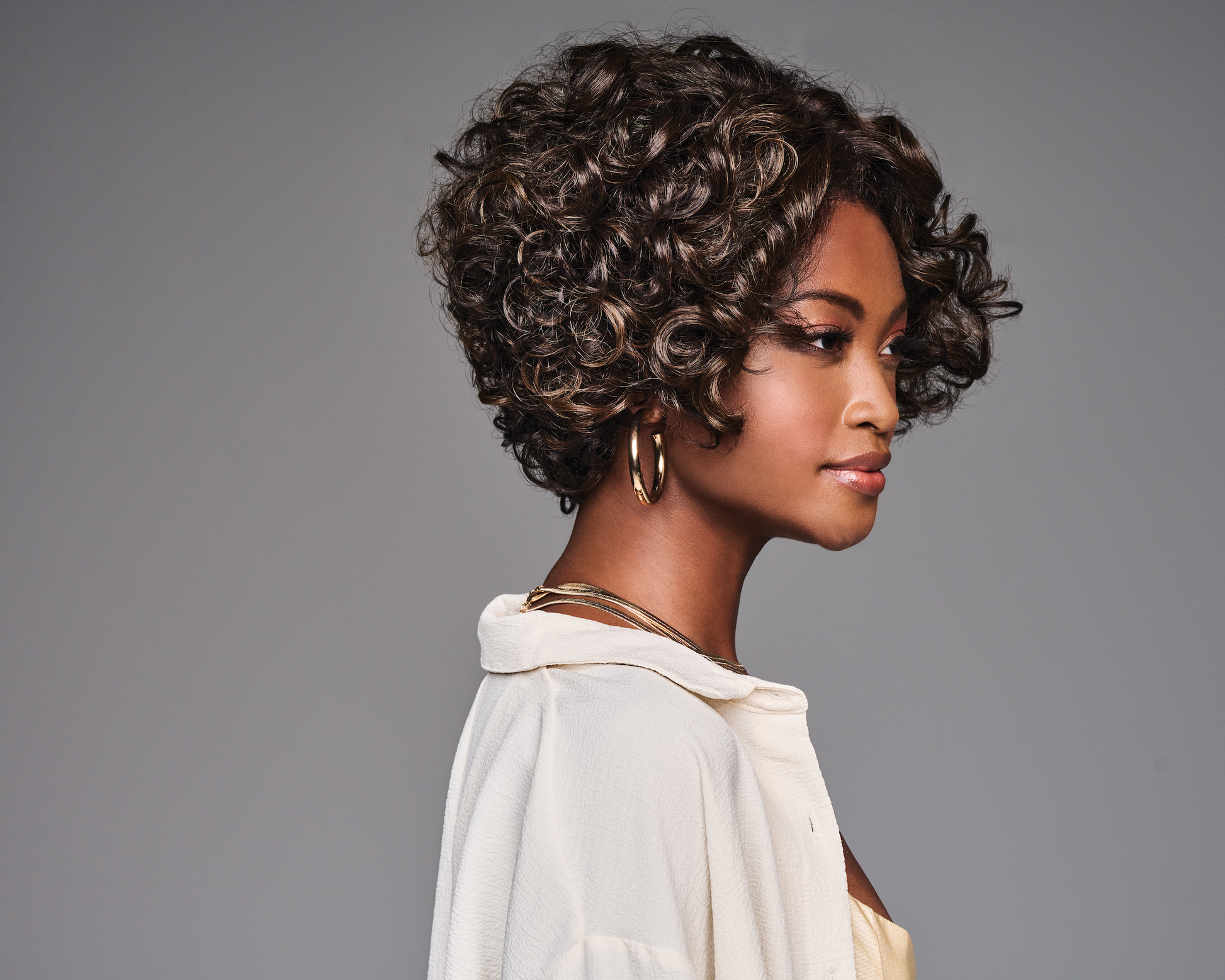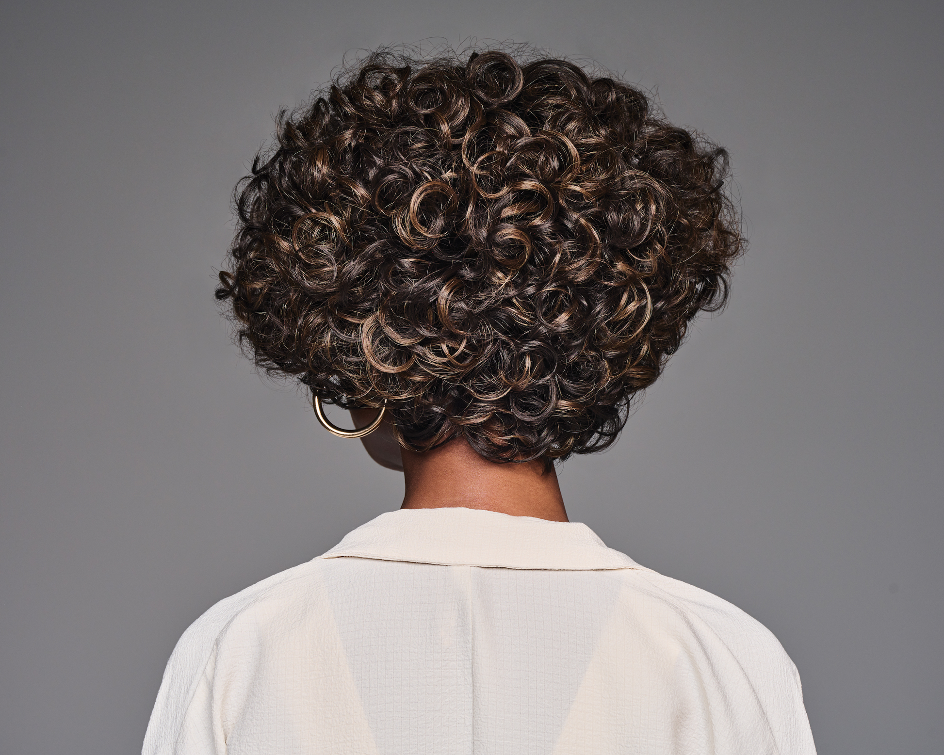 Voluminous spiral curls cropped in a unique shape makes TIERRA the kind of charismatic, center-of-attention style destined to be your new signature look. Stacked fullness at crown and sides tapers at the nape creating a chic V-shape that’s weighted above the ears.