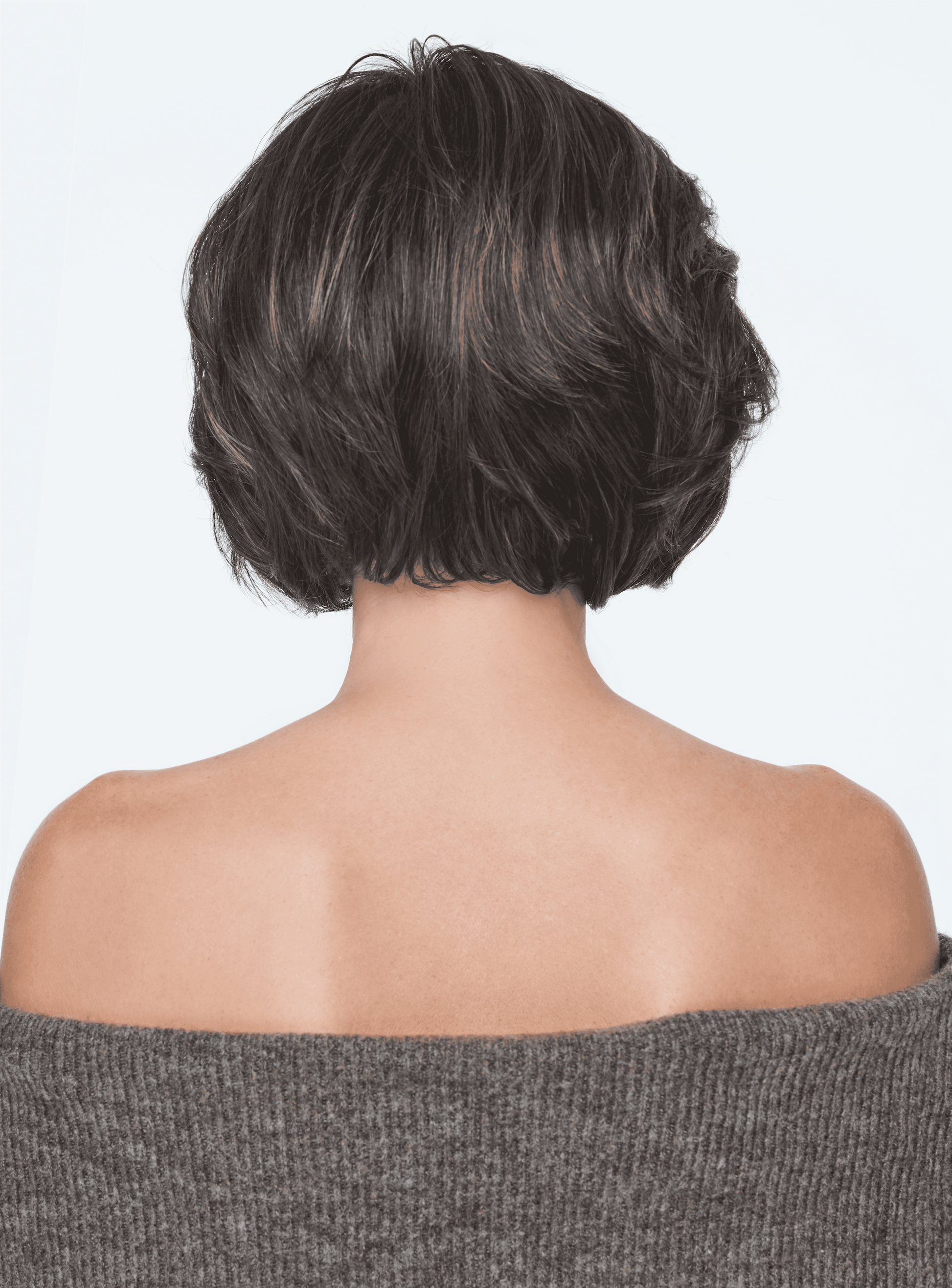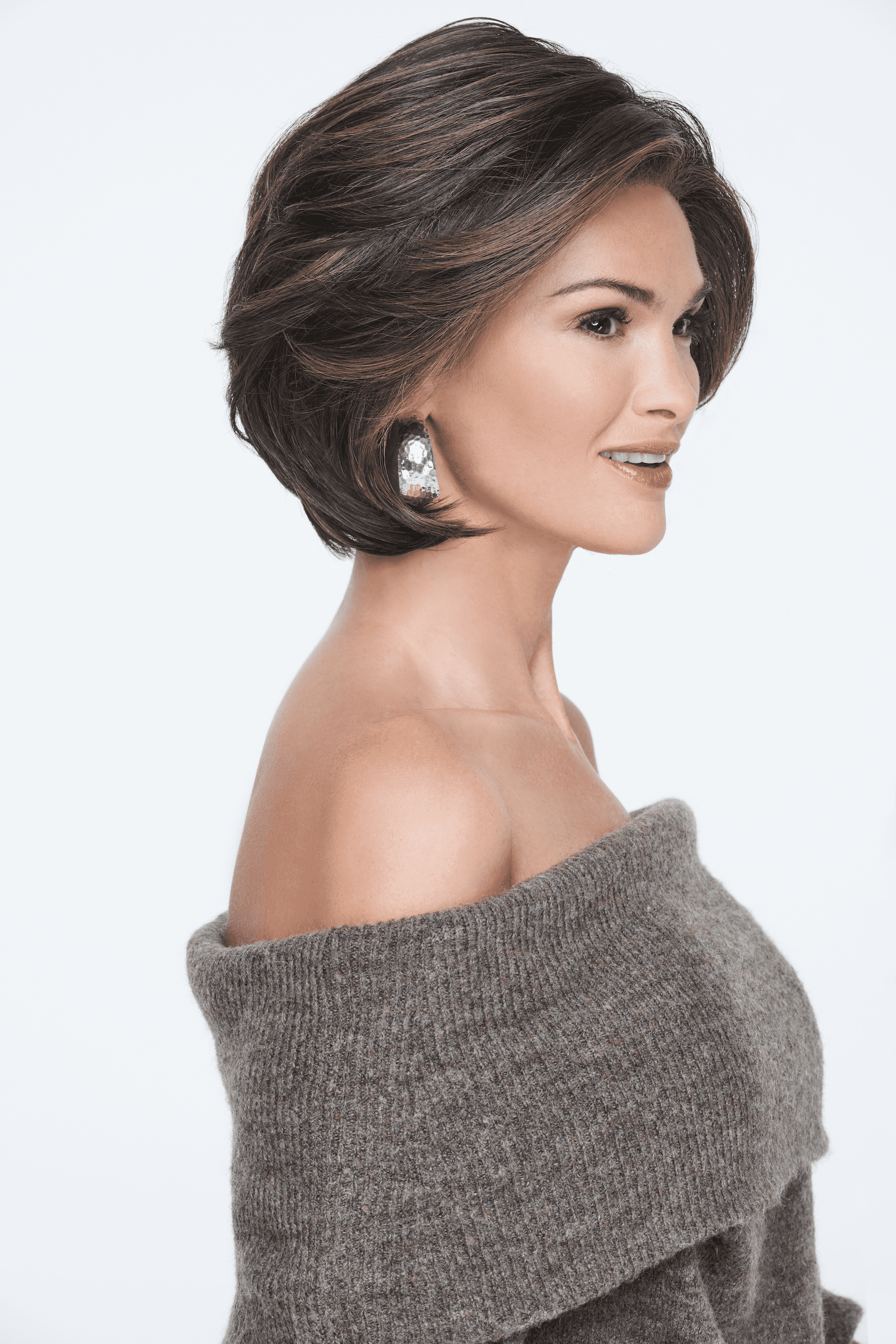 Multi-layering throughout this stacked bob lets YOU call the shots! A shorter crown with length in the front adds volume and offers varied styling options. Gentle waves sweep away from the face creating fullness that can be brushed smooth, tucked behind one ear, or worn loose and tumbled.