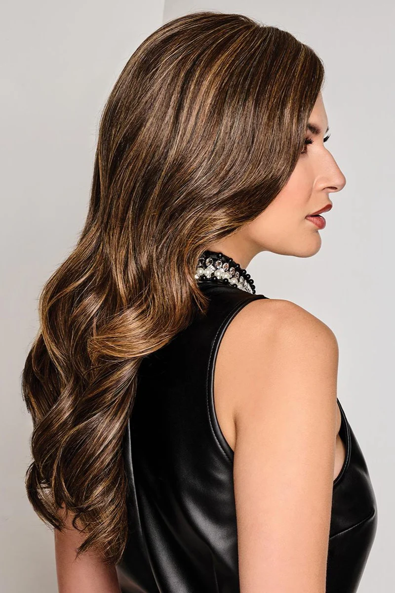Glam glam glam! This super long style makes your every entrance a fashion show runway strut. Lush barrel curls are all directed away from the face. Light layering at the back adds movement and lift. A full monofilament top lets you part as you prefer.