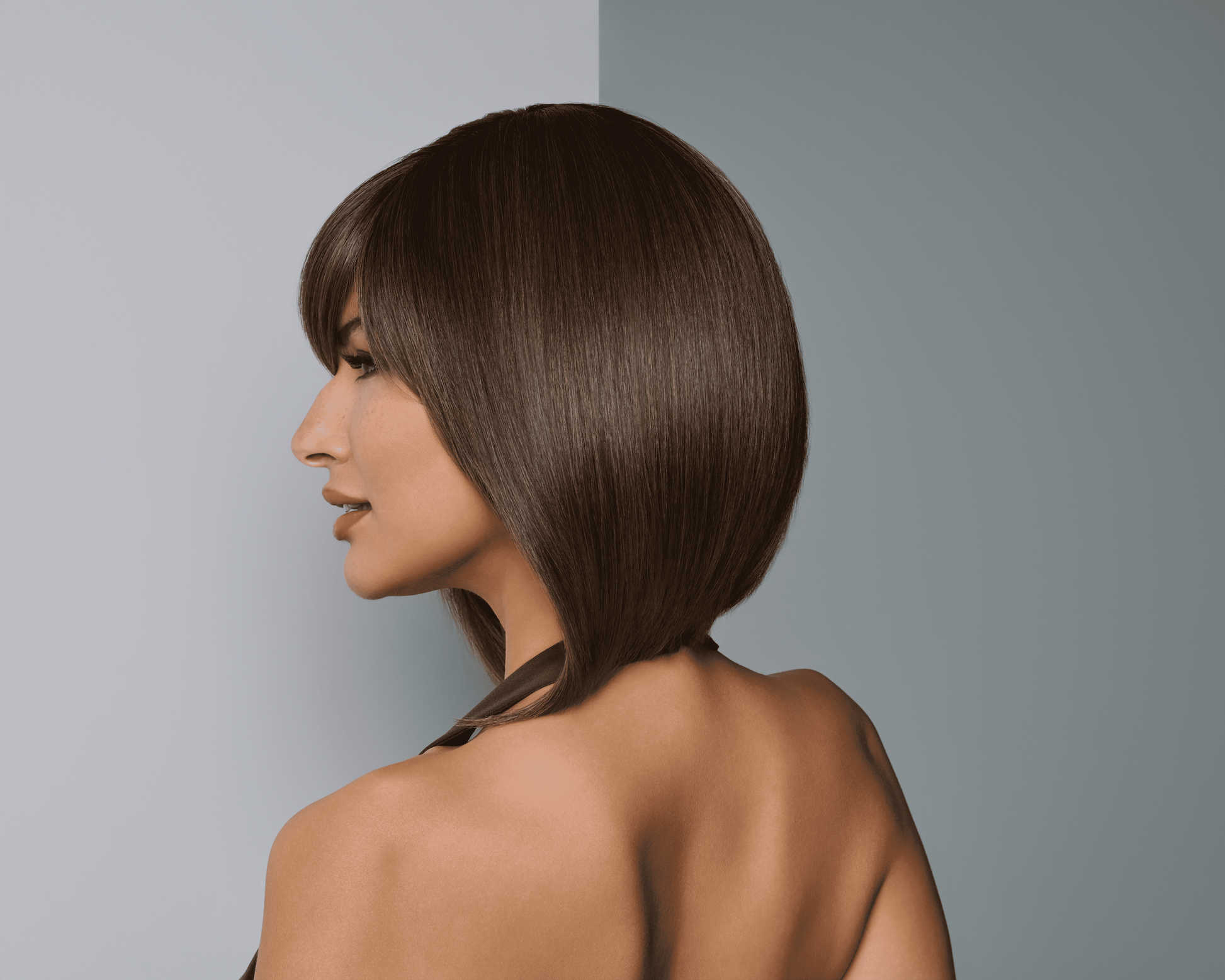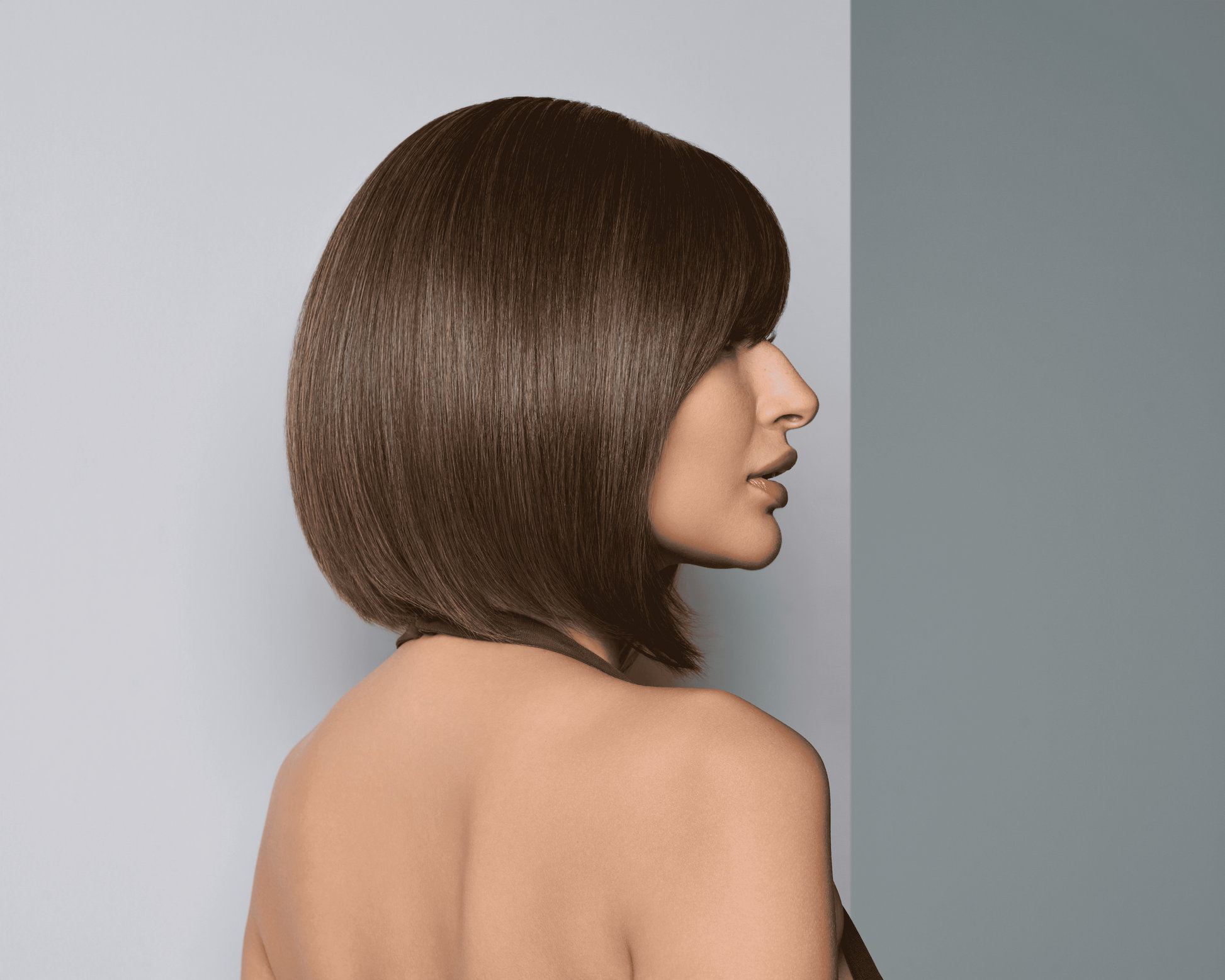 Blunt straight lengths give this modern bob direct impact. Wear with the optional bang to draw attention to the eyes.